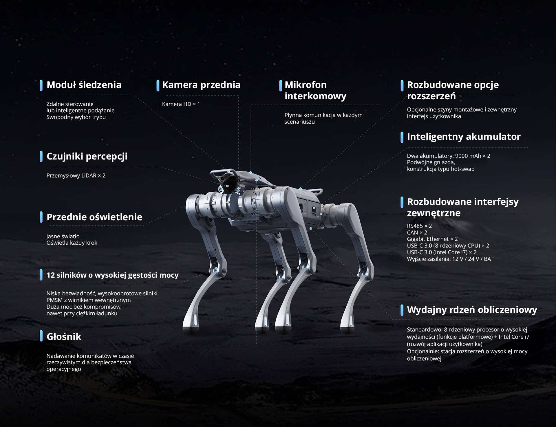 Sercem robota jest zestaw 12 silników PMSM z wewnętrznym rotorem o niskiej bezwładności, które zapewniają dużą siłę i błyskawiczną reakcję nawet przy wysokim obciążeniu. Przemysłowe łożyska krzyżowe w stawach umożliwiają długotrwałą, precyzyjną pracę, a moment obrotowy sięgający około 180 N·m pozwala zachować stabilność i płynność ruchów przy transporcie ciężkich ładunków. Obudowa wykonana ze stopu aluminium i wytrzymałego tworzywa sztucznego dodatkowo zwiększa odporność na uszkodzenia mechaniczne.