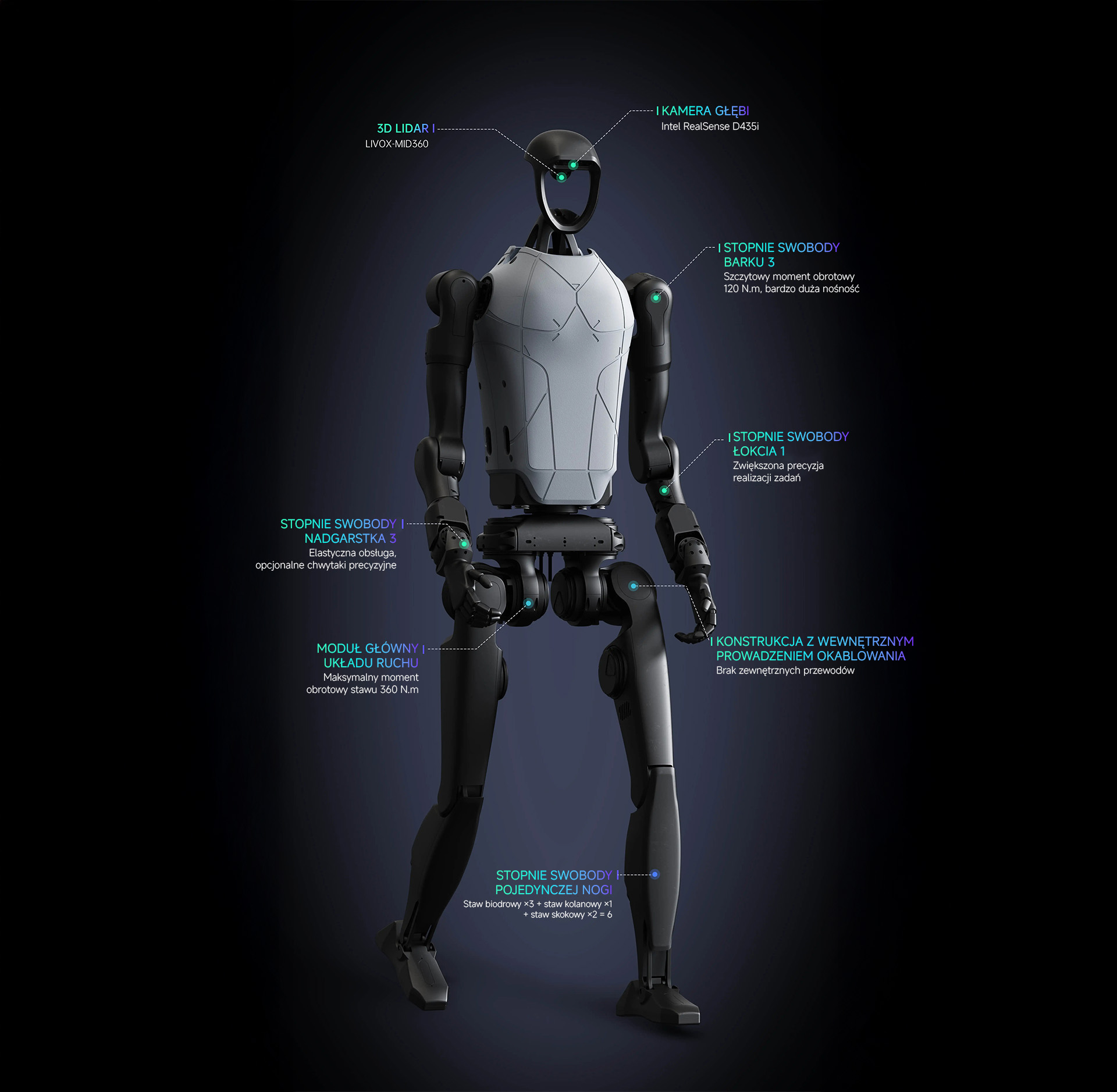 Unitree H1-2 został wyposażony w podwójny enkoder, który odpowiada za dokładne i stabilne odczyty. Takie rozwiązanie pozwala zachować precyzję ruchu bez obaw o zakłócenia. Dodatkowo możliwe jest opcjonalne zastosowanie wyższej mocy obliczeniowej w zależności od potrzeb projektu, a także dalsza rozbudowa i dostosowywanie zasobów do coraz bardziej złożonych zastosowań – producent przewiduje możliwość instalacji do pięciu płyt wewnątrz korpusu.